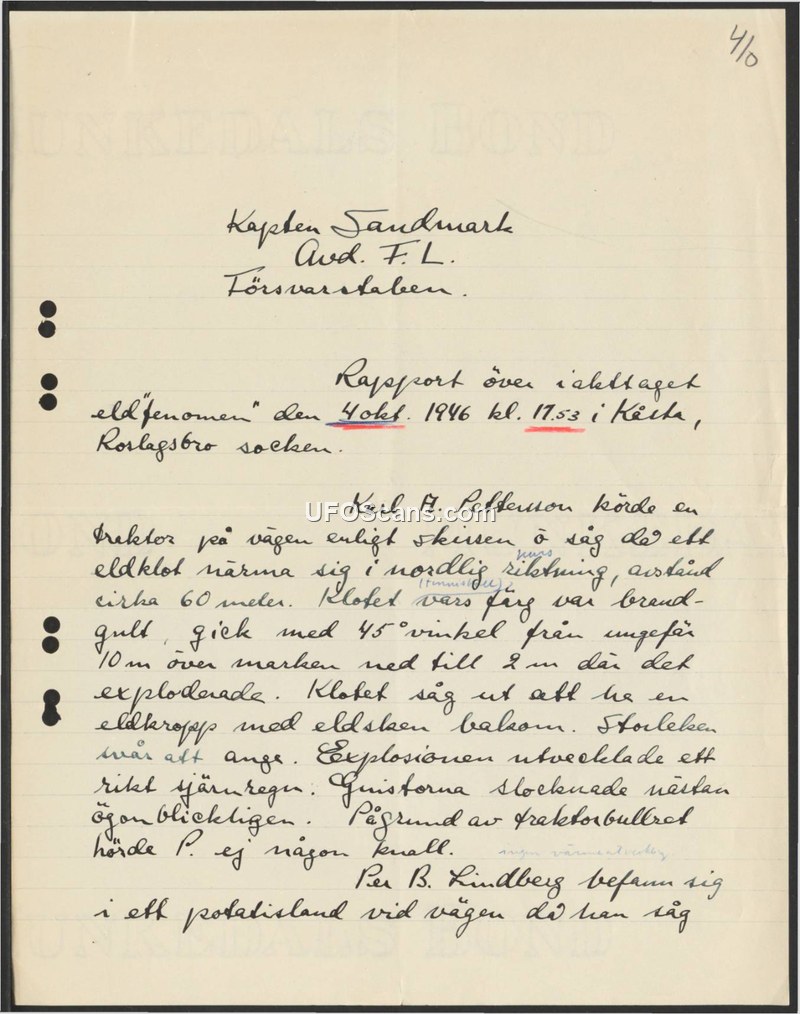 Report on the sighting of a 'fire phenomenon' on October 4, 1946, in Kärr, Roslagsbro parish