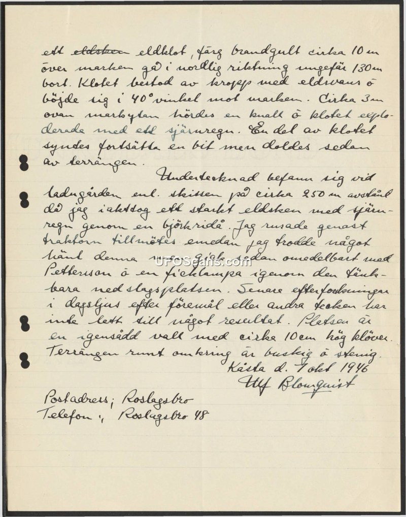 Sighting Report of Fireball — Roslagsbro, Sweden, 1946