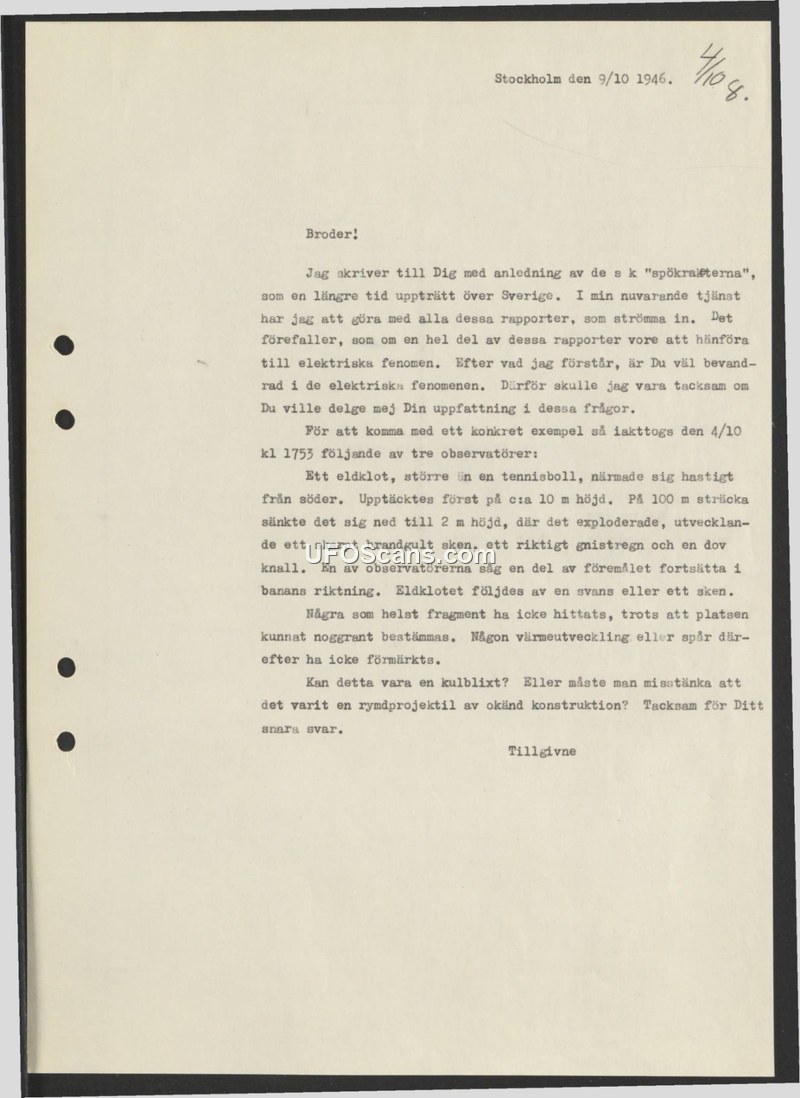 This document is a letter dated October 9, 1946, written from Stockholm. The author, who is professionally involved in processing reports regarding the 'ghost rockets' (spökraketerna) that have been appearing over Sweden for some time, writes to a colleague to solicit their expert opinion on the nature of these phenomena. The author suggests that many of these reports might be attributable to electrical phenomena and asks for the recipient's perspective. To illustrate the nature of the reports being received, the author provides a specific account from October 4, 1946, at 17:55. According to three observers, a fireball larger than a tennis ball approached rapidly from the south. It was first sighted at an altitude of approximately 10 meters. Over a distance of 100 meters, it descended to an altitude of 2 meters, where it exploded, producing a bright brand-yellow light, a shower of sparks, and a dull bang. One observer noted that a portion of the object continued along its original path. The fireball was accompanied by a tail or a glow. Despite the location being precisely determined, no fragments were found, and no signs of heat or other traces were observed. The author concludes by asking if this could be ball lightning or if it must be suspected to be a space projectile of unknown construction, requesting a prompt reply.
