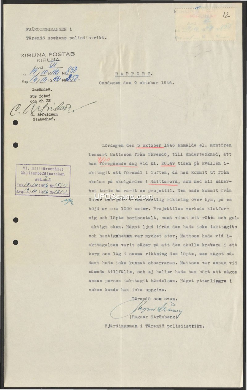 This report, dated October 9, 1946, documents a sighting reported by an electrical fitter named Lennart Mattsson. On October 5, 1946, at 20:49, Mattsson was leaving a school in Saittarova when he observed an object in the sky. He described the object as spherical and noted that it moved horizontally from the east in a straight westerly direction at an altitude of approximately 1000 meters. The object exhibited a reddish-yellow glow and traveled at a very high speed without making any sound. Mattsson stated that he was certain the object would crash into a mountain located in its flight path, but he observed no such impact. The witness was alone at the time of the sighting and reported that he had not heard of any other individuals observing the event. The report was filed by Ragnar Strömberg, a Fjärdingsman (a local police official) in the Tärendö police district.
