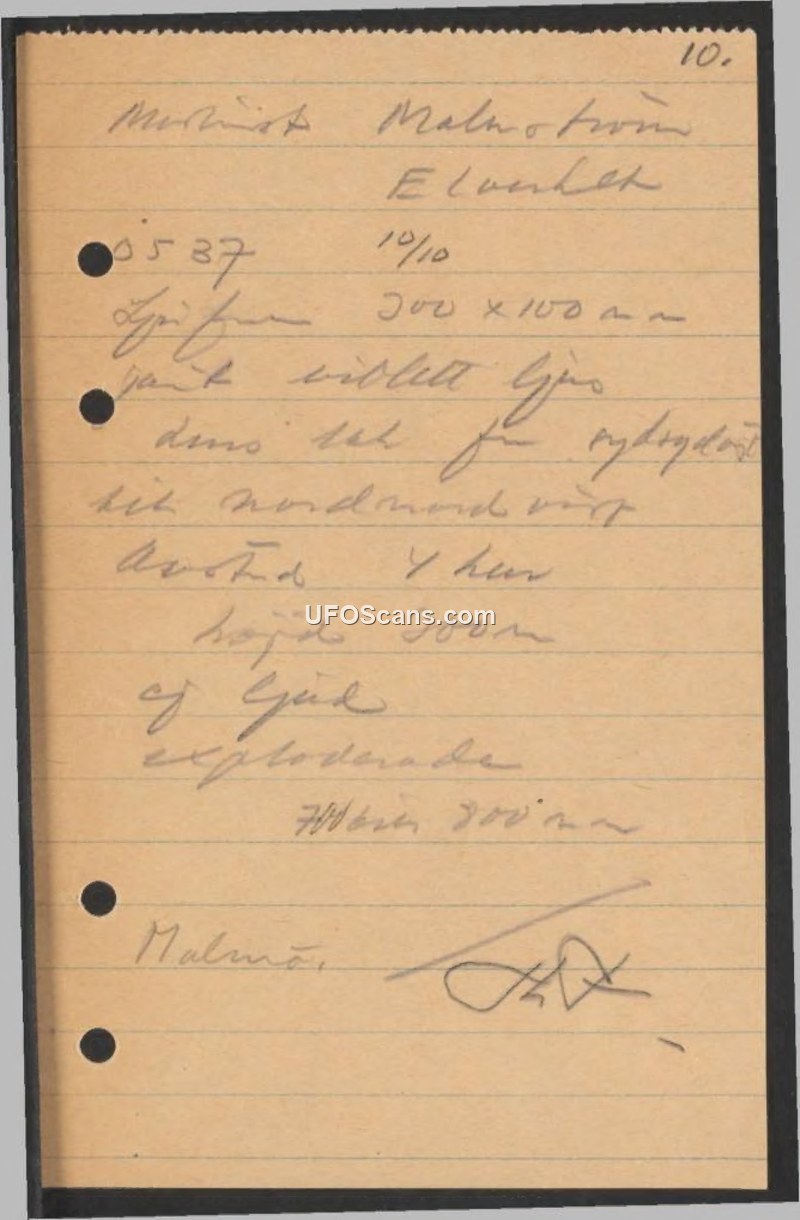 A handwritten report from Malmö, Sweden, describing a 4-hour sighting of a large, violet, aerial object that eventually exploded. The event occurred on October 10th at 05:37.