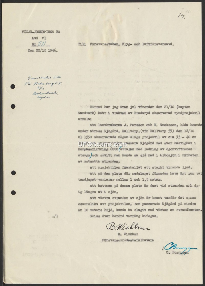 Report on Sighting of Space Projectile near Bredaryd, October 1946