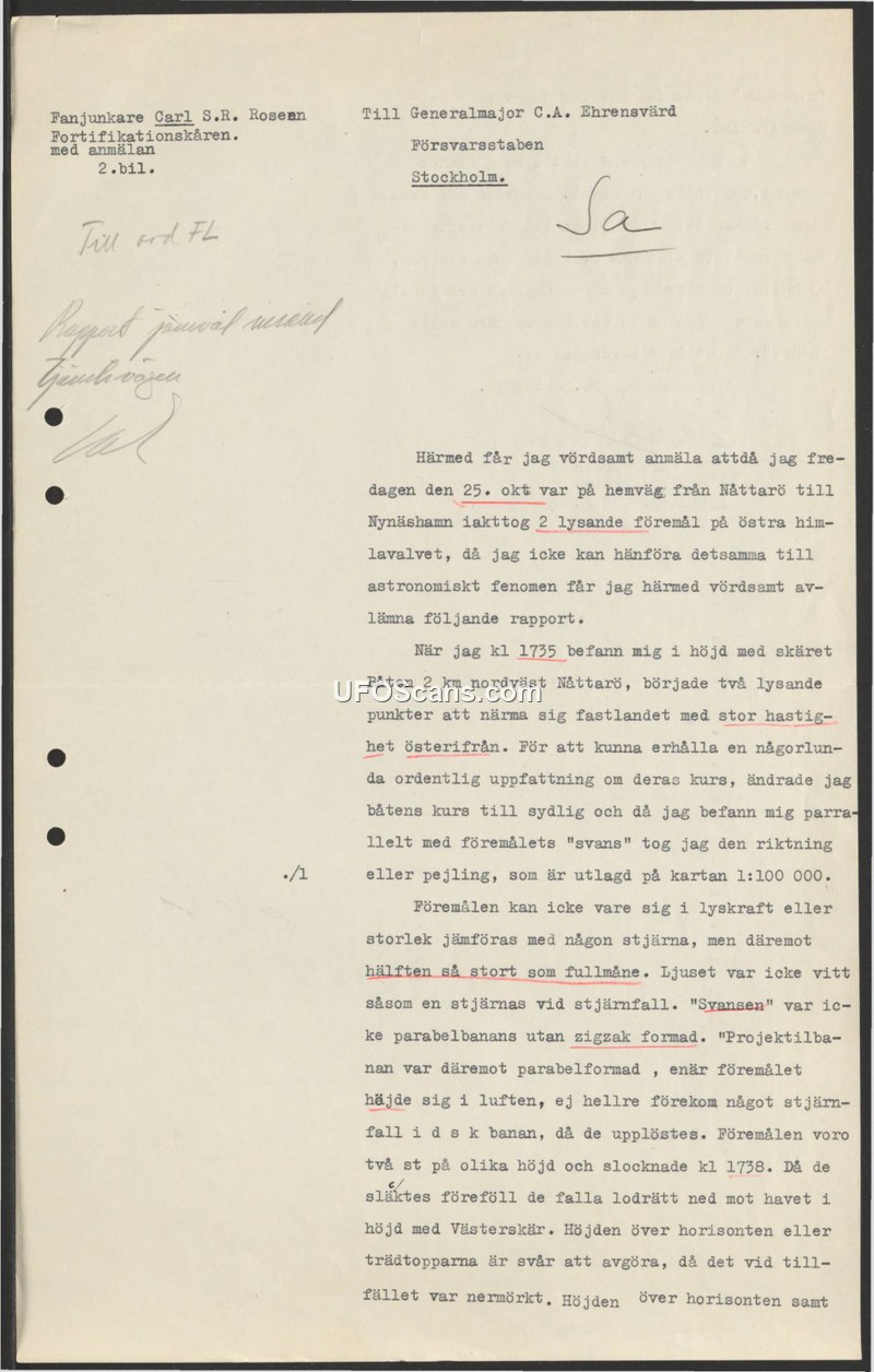 This document is a formal report submitted by Fanjunkare Carl S.R. Rosemi of the Fortifikationskåren to Generalmajor C.A. Ehrensvärd at the Swedish Defence Staff (Försvarsstaben). The report details a sighting that occurred on October 25th while the author was traveling from Nåttarö to Nynäshamn. At 1735, while near the skerry Båten, the author observed two luminous objects approaching the mainland from the east at high speed. The author notes that the objects could not be identified as astronomical phenomena. He describes the objects as being approximately half the size of a full moon and notes that their light was not white like a falling star. A notable feature described is a 'tail' that was zigzag-shaped, while the trajectory of the objects themselves was parabolic. The objects were observed at different altitudes and eventually extinguished at 1738. Upon extinguishing, they appeared to fall vertically toward the sea in the vicinity of Västerskär. The author mentions that it was difficult to determine the altitude of the objects relative to the horizon or treetops due to the darkness at the time of the incident. The report includes a reference to a bearing or direction plotted on a 1:100,000 scale map.