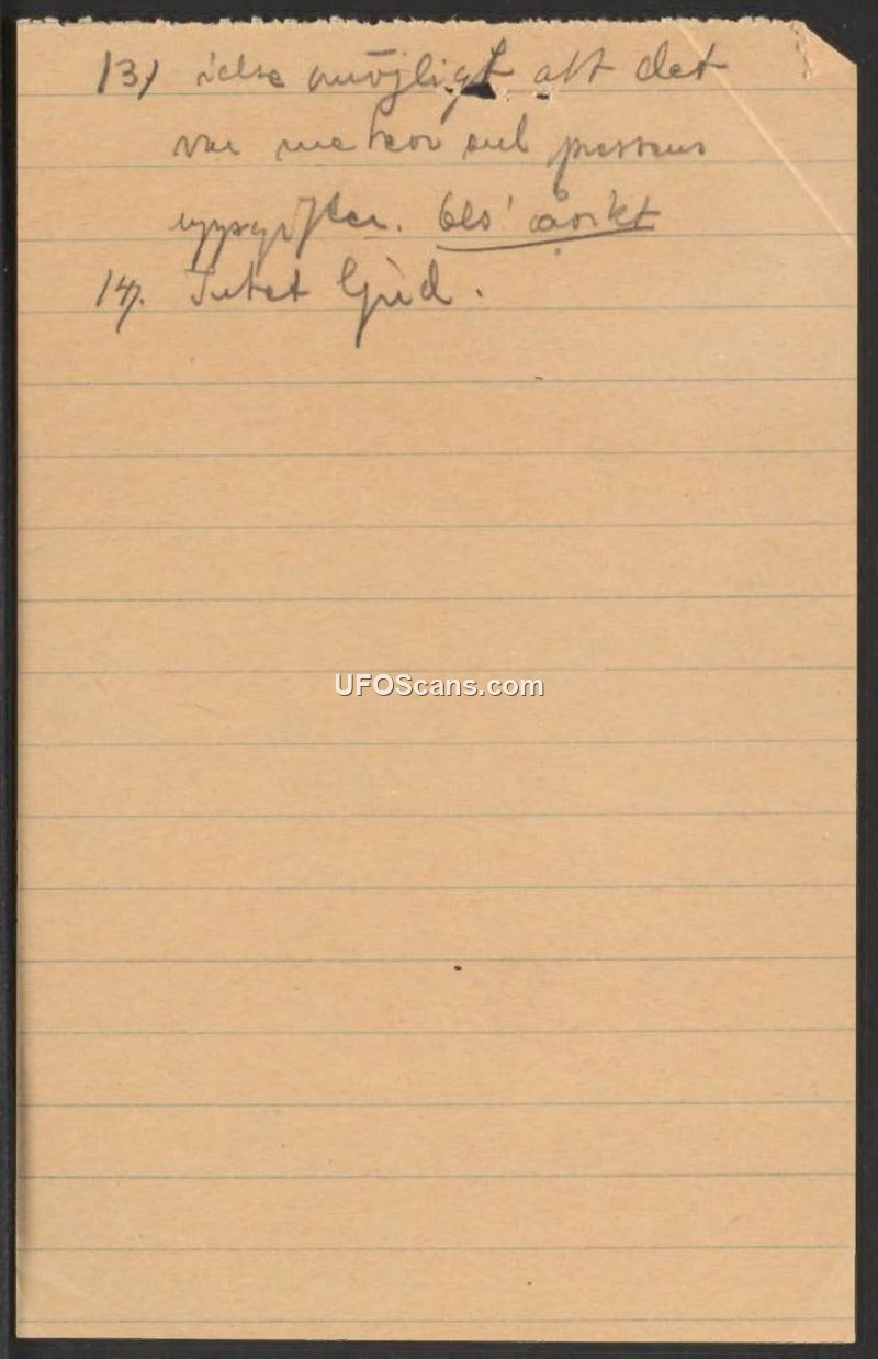 This document consists of two brief, handwritten points in Swedish. Point 13 notes that it is not impossible that the observations were meteorological or related to persons, with the phrase 'blivit anket' (possibly 'investigated' or 'inquired') underlined. Point 14 states simply that there was no sound.