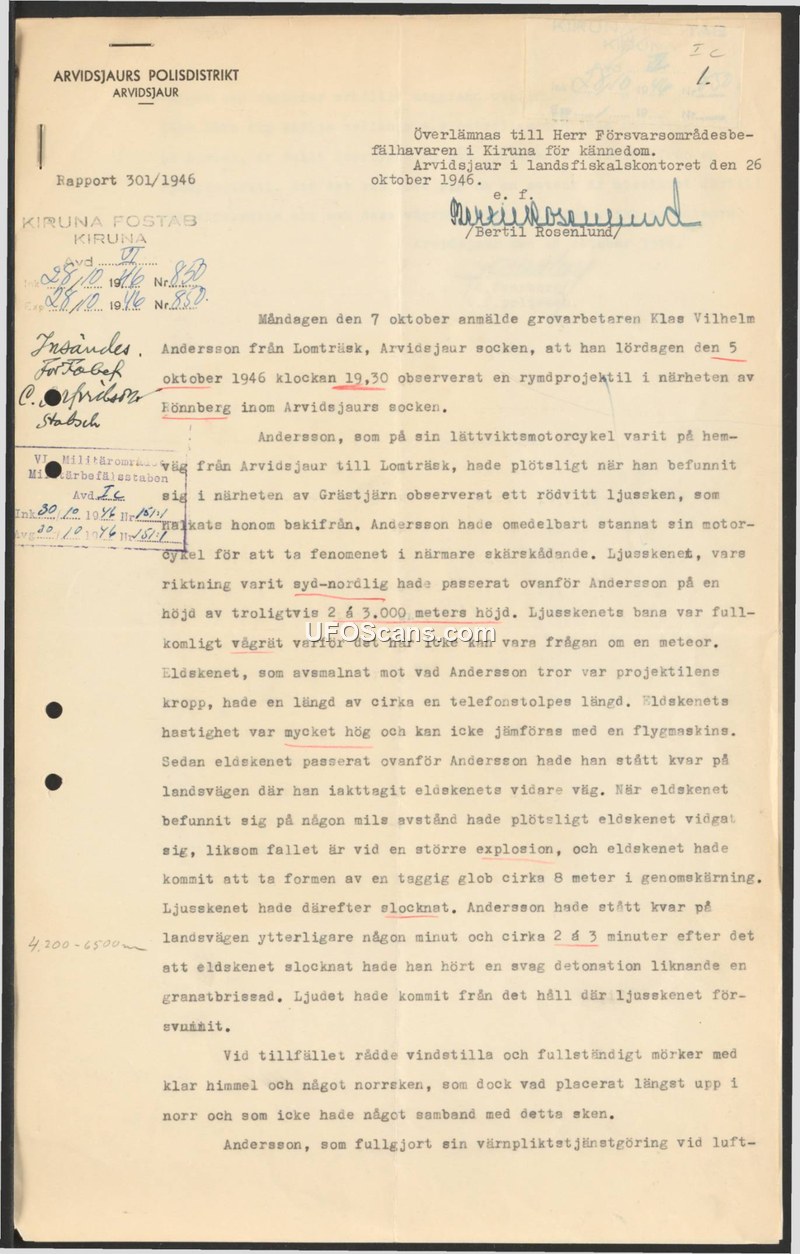 Rapport 301/1946 — Sighting Report, Arvidsjaur, October 1946