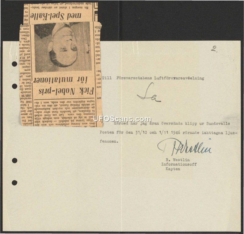 Härmed har jag äran översända klipp ur Sundsvalls Posten för den 31/10 och 1/11 1946 rörande iakttagna ljusfenomen.