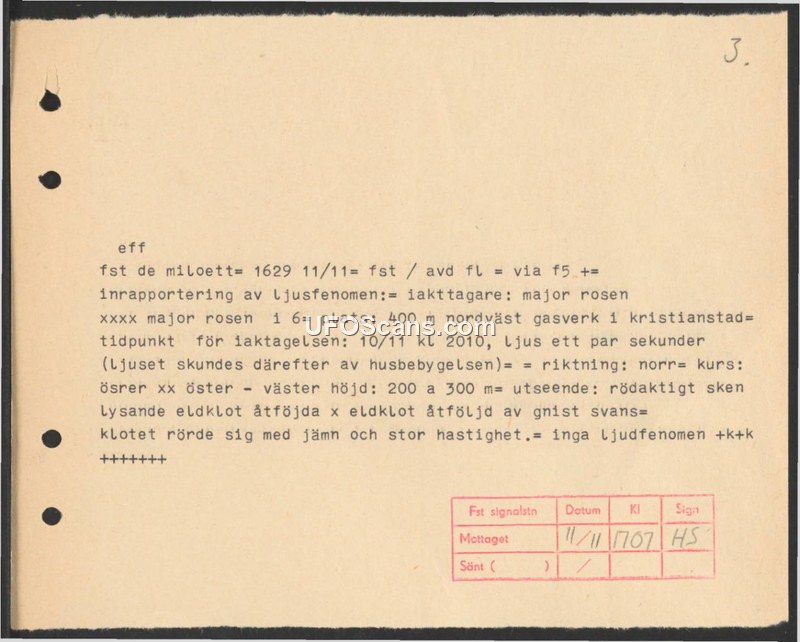 Sighting Report of Luminous Phenomenon — Kristianstad, Sweden, November 1967