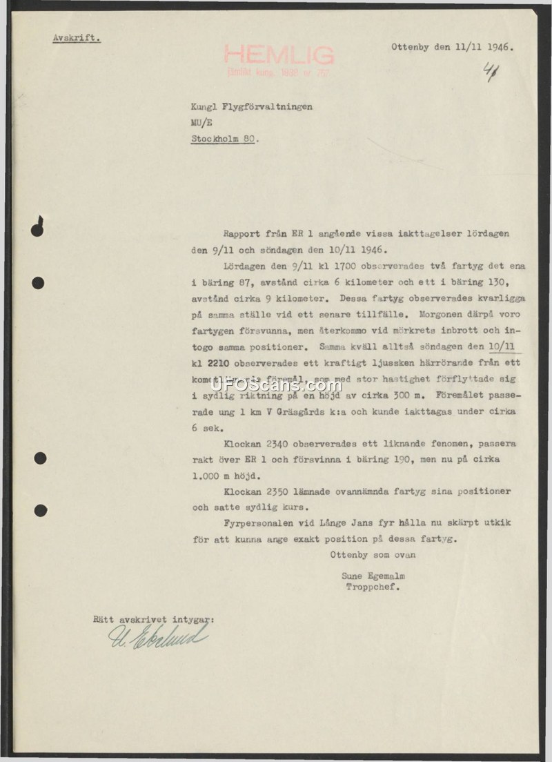 This document is a secret report issued by the Royal Air Administration (Kungl Flygförvaltningen) on November 11, 1946, regarding observations made at ER 1 and the Långe Jan lighthouse. On Saturday, November 9, 1946, at 1700, two vessels were observed at bearings 87 and 130, at distances of approximately 6 and 9 kilometers, respectively. These vessels remained stationary but disappeared by the following morning. They returned at nightfall on Sunday, November 10, 1946, and resumed their previous positions. On the evening of November 10, at 2210, a powerful light originating from a comet-like object was observed moving at high speed in a southerly direction at an altitude of approximately 300 meters. This object passed about 1 kilometer west of the Gräsgård church and was visible for approximately 6 seconds. A second, similar phenomenon was observed at 2340, passing directly over ER 1 at an altitude of approximately 1,000 meters before disappearing at bearing 190. At 2350, the aforementioned vessels left their positions and set a southerly course. The lighthouse personnel at Långe Jan were instructed to maintain a sharp lookout to determine the exact positions of these vessels.