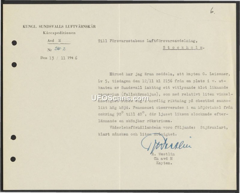 On November 13, 1946, Captain R. Westlin of the Royal Sundsvall Anti-Aircraft Corps submitted a report to the Air Defense Department of the Defense Staff in Stockholm. The report details an observation made by Captain G. Leissner of the Lv 5 unit on the evening of November 12, 1946. At 21:56, while located on the outskirts of Sundsvall, Captain Leissner observed a white, glowing, spherical object that resembled magnesium, similar to a flare. The object moved in a northerly direction at a relatively low angular velocity at an undetermined, though likely high, altitude. The phenomenon was observed at an elevation angle ranging from approximately 90 degrees down to 40 degrees, at which point the light appeared to extinguish, leaving behind a visible smoke trail. The weather conditions at the time were reported as starry with clear moonlight and minimal cloud cover.