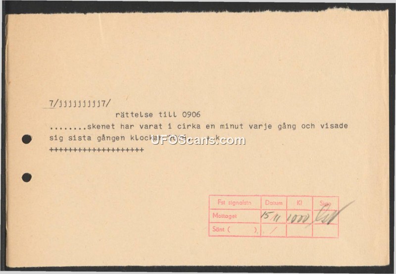 This document serves as a correction to a previous report (0906), clarifying that the observed light appeared for about one minute each time and was last seen at 20:16.