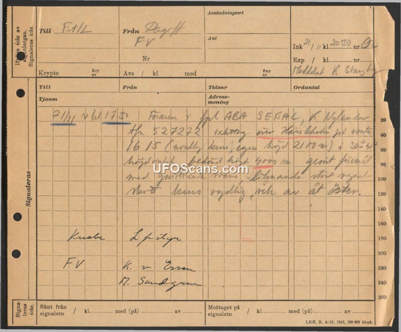 A Swedish military report documenting an aerial sighting by an ABA SEBAC employee on November 21st at 17:50, involving an object at 2100 meters altitude.