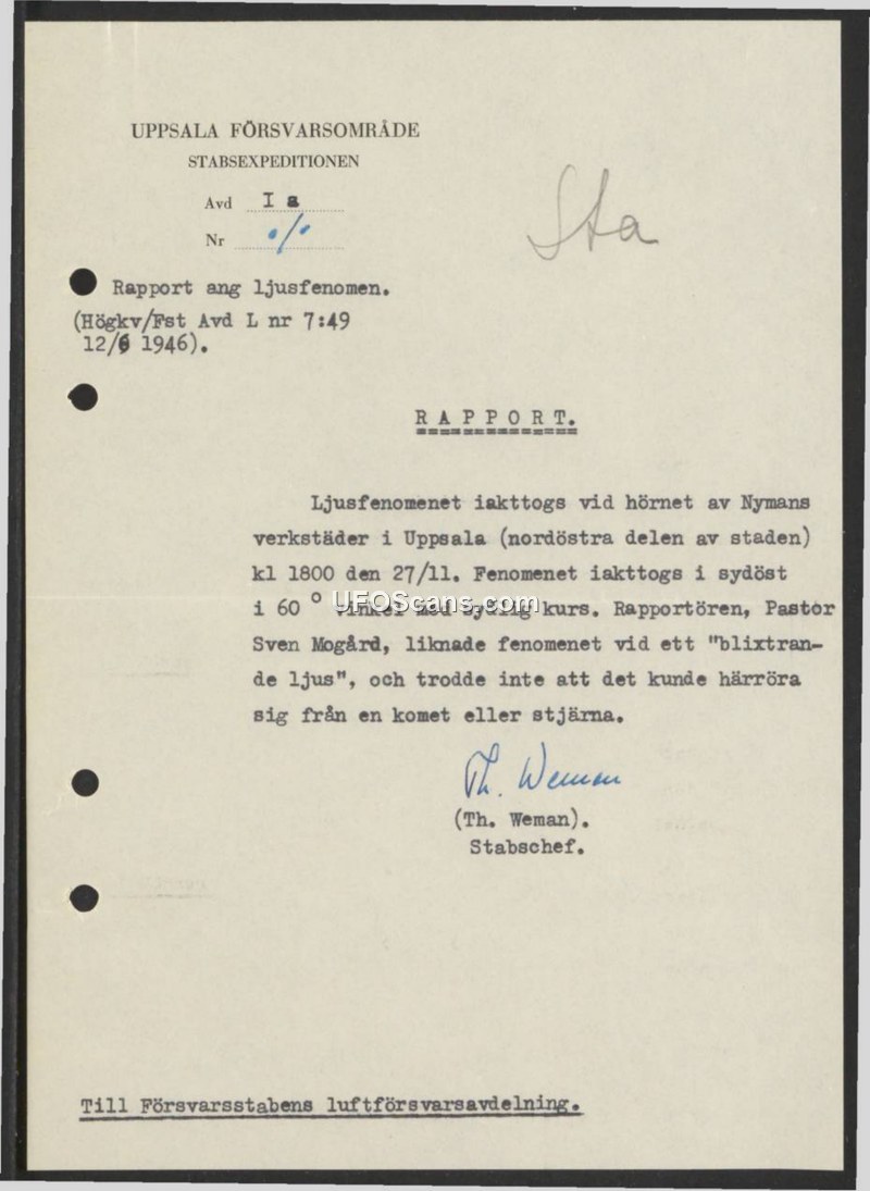 A 1946 Swedish military report documenting a sighting of a 'flashing light' in Uppsala by Pastor Sven Mogård. The witness ruled out astronomical origins for the object, which was observed moving on a southerly course.