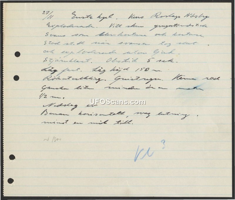 This document is a brief, handwritten sighting report dated November 27th, concerning an incident in Roslags Näsby. The observer reports that an object, described as being quite small—approximately half a meter in size—was observed in the sky. The object was traveling at a low speed at an altitude of 150 meters. The flight path is described as horizontal. The observer noted that the object exhibited smoke and sparks, and appeared red in color. The object eventually exploded without sound. The observation occurred under a clear sky and lasted for approximately five seconds.