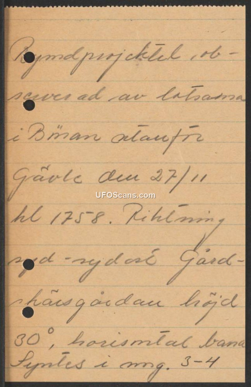 A handwritten report from Sweden dated November 27, 1958, describing the sighting of a space projectile near Gävle. The object was observed at a 30-degree altitude moving on a horizontal path for 3-4 minutes.