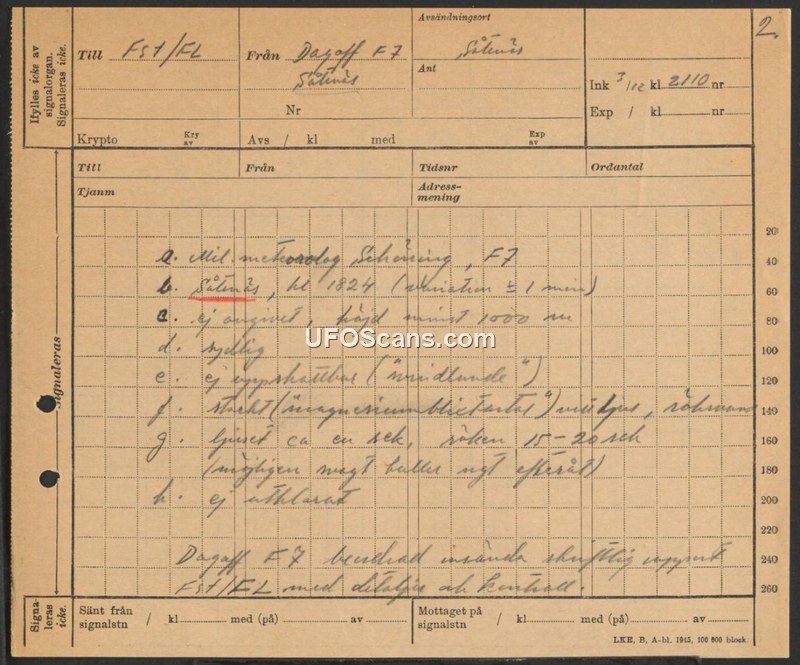 The report documents a sighting by a military meteorologist at F7. The object was observed at an altitude of at least 1000 meters, appearing like a magnesium flare. The observation lasted 15-20 seconds, with the object itself visible for approximately one second.