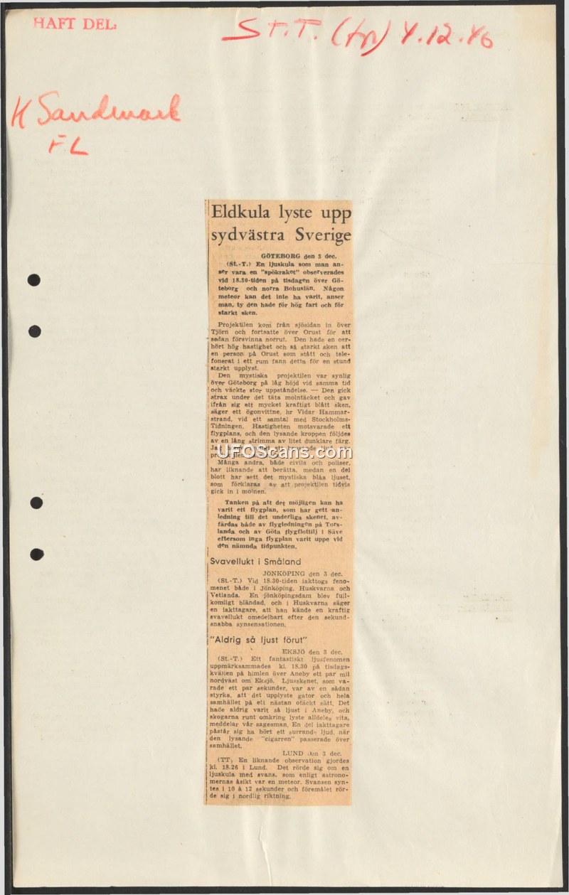 A series of reports from December 1986 describe a luminous, high-speed object sighted across southwestern Sweden. Authorities confirmed no military or civilian aircraft were in the area at the time of the sightings.
