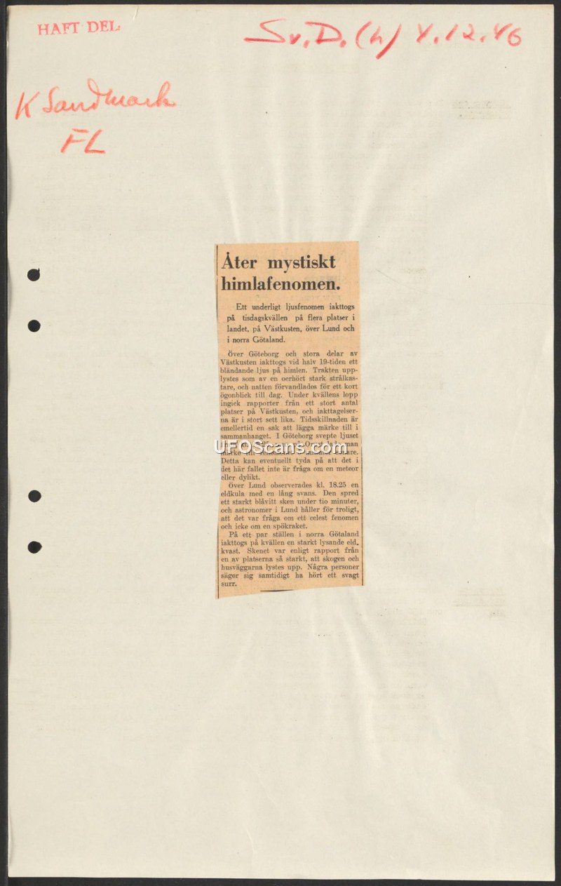 A newspaper report from December 1946 describes widespread sightings of a mysterious, bright aerial phenomenon across Sweden. Astronomers in Lund attributed the event to a celestial occurrence rather than a ghost rocket.