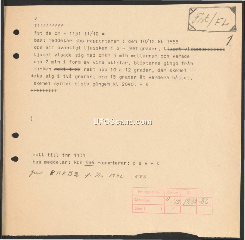 This document is a Swedish military report (Fst) dated December 11, 1946, regarding an unusual light sighting that occurred on December 10, 1946. The report details that at 1855 hours, an unusual light was observed. The phenomenon manifested as white flashes appearing at intervals of approximately three minutes, with each flash lasting about two minutes. The trajectory of these flashes was described as moving from the ground straight upward at an angle of 10 to 12 degrees. At that point, the light split into two distinct branches, each moving approximately 15 degrees in opposite directions. The light was observed until 2040 hours. The document references control number 1131 and mentions reporting from 'kbs' (likely a military or coastal observation station).