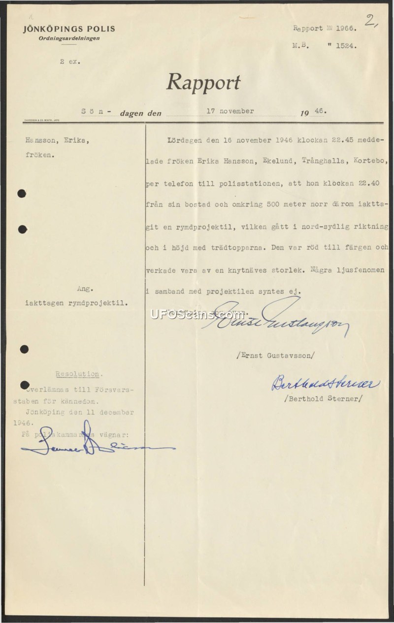 On November 17, 1946, the Jönköping Police issued a report regarding a sighting reported by Miss Erika Hansson of Ekelund, Trånghalla, Kortebo. According to the report, Miss Hansson contacted the police station at 22:45 on November 16, 1946, to state that at 22:40, she had observed a 'space projectile' (rymdprojektil) from her residence. She described the object as being red in color and approximately the size of a clenched fist. The object was observed moving in a north-to-south direction at the height of the treetops. Miss Hansson noted that there were no light phenomena associated with the projectile. The report was signed by Ernst Gustavsson and Berthold Sterner. On December 11, 1946, a resolution was added to the document, noting that it was to be forwarded to the Swedish Defense Staff (Försvarsstaben) for their information.