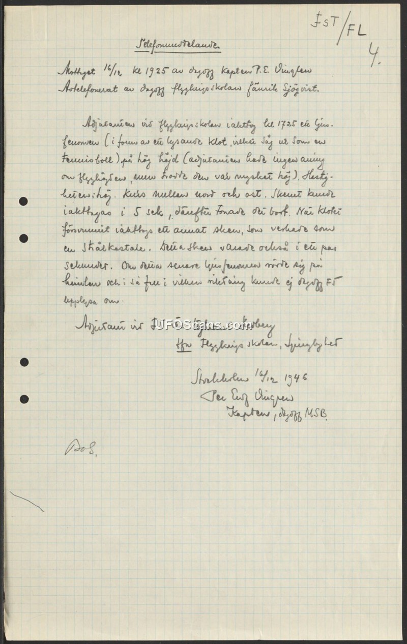 This document is a telephone report recorded by Captain Per Eng Vingren on December 16, 1946, regarding a sighting that occurred on December 16, 1925. The report details an observation made by an Ensign named Sjökvist at the F5 Air Wing. At 17:25, the witness observed a luminous object, described as resembling a tennis ball, at a very high altitude. The object was moving between the north and east and remained visible for approximately five seconds before disappearing. Following the disappearance of the first object, a second object was observed, which appeared similar to a searchlight. This second object was visible for a couple of seconds. The report notes that the witness could not explain the nature of these objects as they moved across the sky. The document concludes by identifying the Adjutant at F5 as Lieutenant Sjöberg.