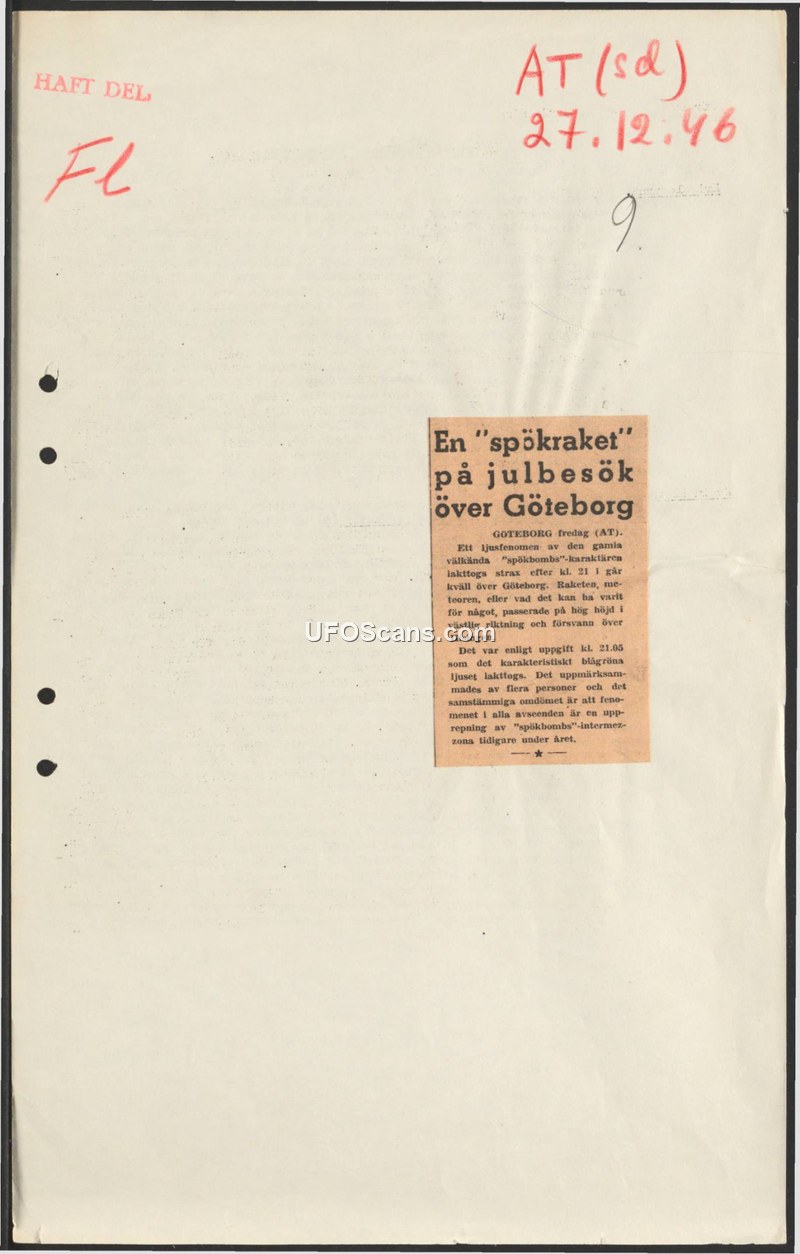 A newspaper report from December 1946 details a 'ghost bomb' sighting over Gothenburg, Sweden. Multiple witnesses observed a blue-green light moving at high altitude.
