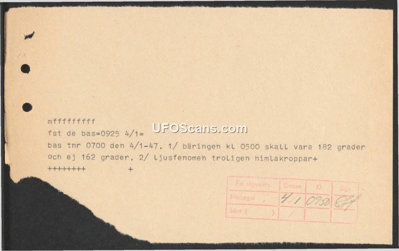 A 1947 Swedish military communication correcting a bearing for a light phenomenon observation. The phenomenon was officially attributed to celestial bodies.