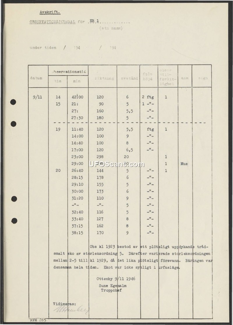 A Swedish military observation log from 1946 documenting radar tracking of an unidentified aerial phenomenon at Ottenby. The report details a specific radar echo that appeared and disappeared suddenly while maintaining a constant bearing.