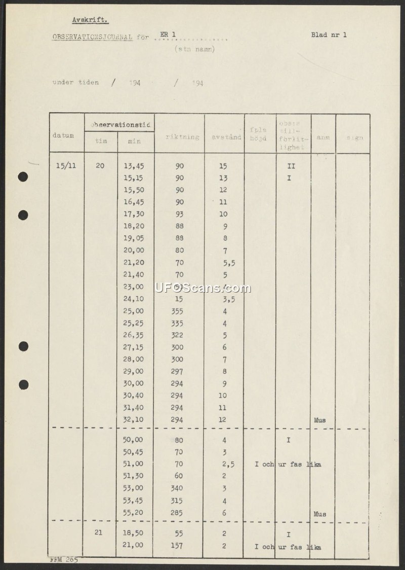 This is an observation log from station ER 1 dated November 15th, tracking unidentified aerial phenomena. It records precise timing, direction, and altitude data, noting instances where objects appeared to be 'in and out of phase'.