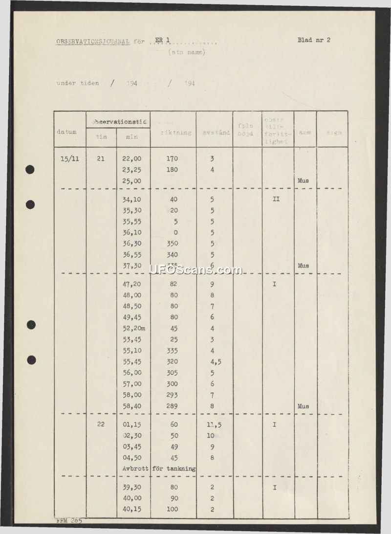 This is a technical observation log from station ER 1 dated November 15th, recording aerial tracking data including time, direction, distance, and altitude. The log includes a notation for a refueling break at 22:04:50.