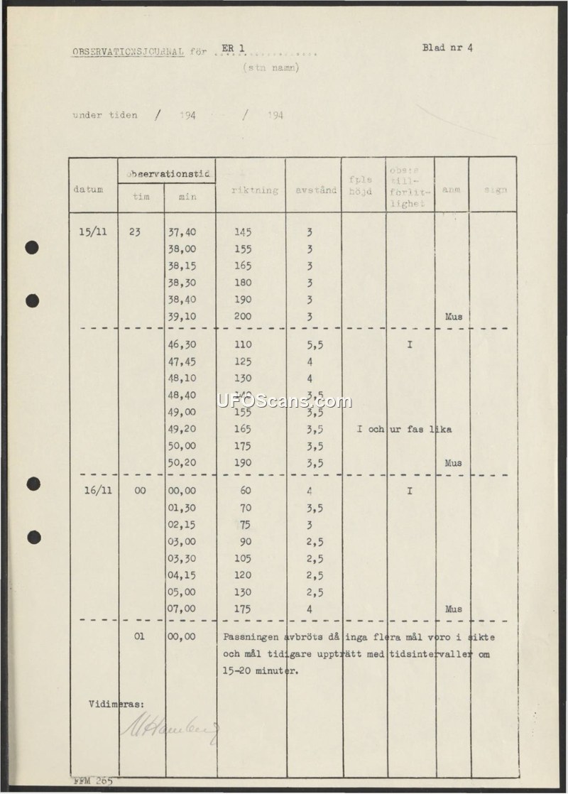 This document is a page from an observation journal (Blad nr 4) for a station designated E.R 1. It records a series of aerial observations occurring between the night of November 15 and the early morning of November 16. The log tracks specific times, directions, and distances for various targets. The entries show a pattern of activity where targets were observed moving through different bearings and distances. At 01:00 on November 16, the tracking was officially discontinued because no further targets were in sight. The log notes that the targets had been appearing at regular intervals of approximately 15 to 20 minutes. The document is signed by an illegible signatory under the heading 'Vidimeras' (Certified).