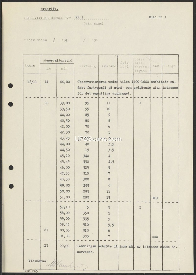 This document is an observation journal (Observationsjournal) for a station designated 'ER 1'. The log covers activities on November 16th. The initial entry notes that between 14:00 and 16:00, the station observed only routine north and south-bound air traffic, which was considered irrelevant to the primary mission. Later in the evening, beginning at 20:39, the log records a series of specific observations, tracking targets by bearing and distance. These observations continued until 21:01. The journal concludes with a final entry at 23:00, stating that the watch was terminated because no further targets of interest could be observed. The document is written in Swedish and includes a signature at the bottom, though the name is not clearly legible.