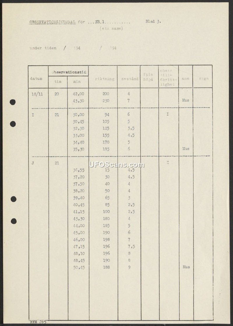 This is a Swedish military-style observation log from November 18th, recording the time, direction, and altitude of aerial objects. It serves as a raw data record for tracking unidentified phenomena.