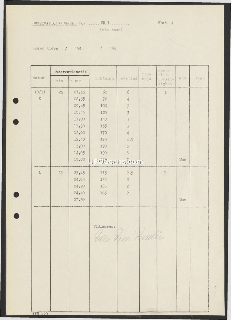 This document is a Swedish military-style observation log from November 18th, recording directional and distance data for aerial objects. It serves as a historical record of tracking unidentified phenomena.