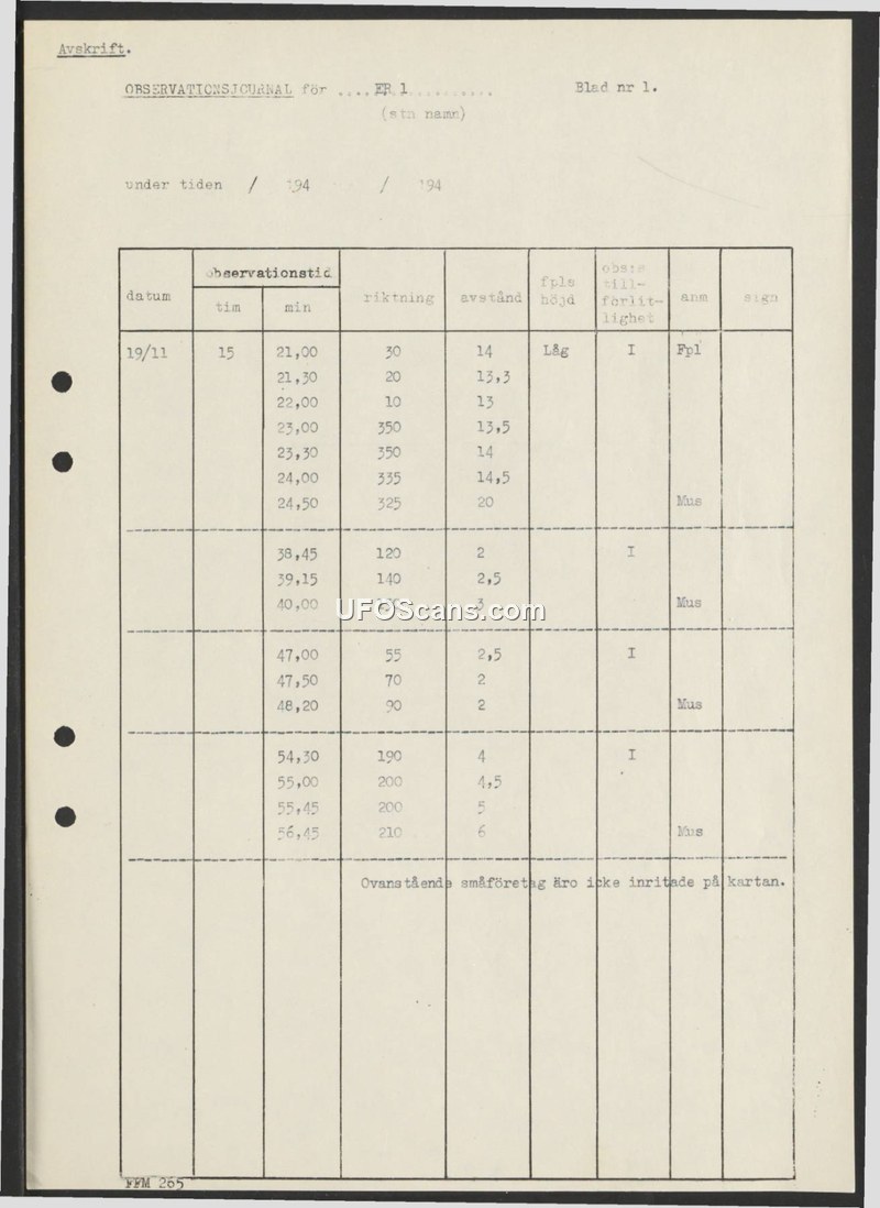 A Swedish observation journal log from November 19th documenting multiple low-altitude aerial sightings. The document notes that these small objects were not plotted on the map.