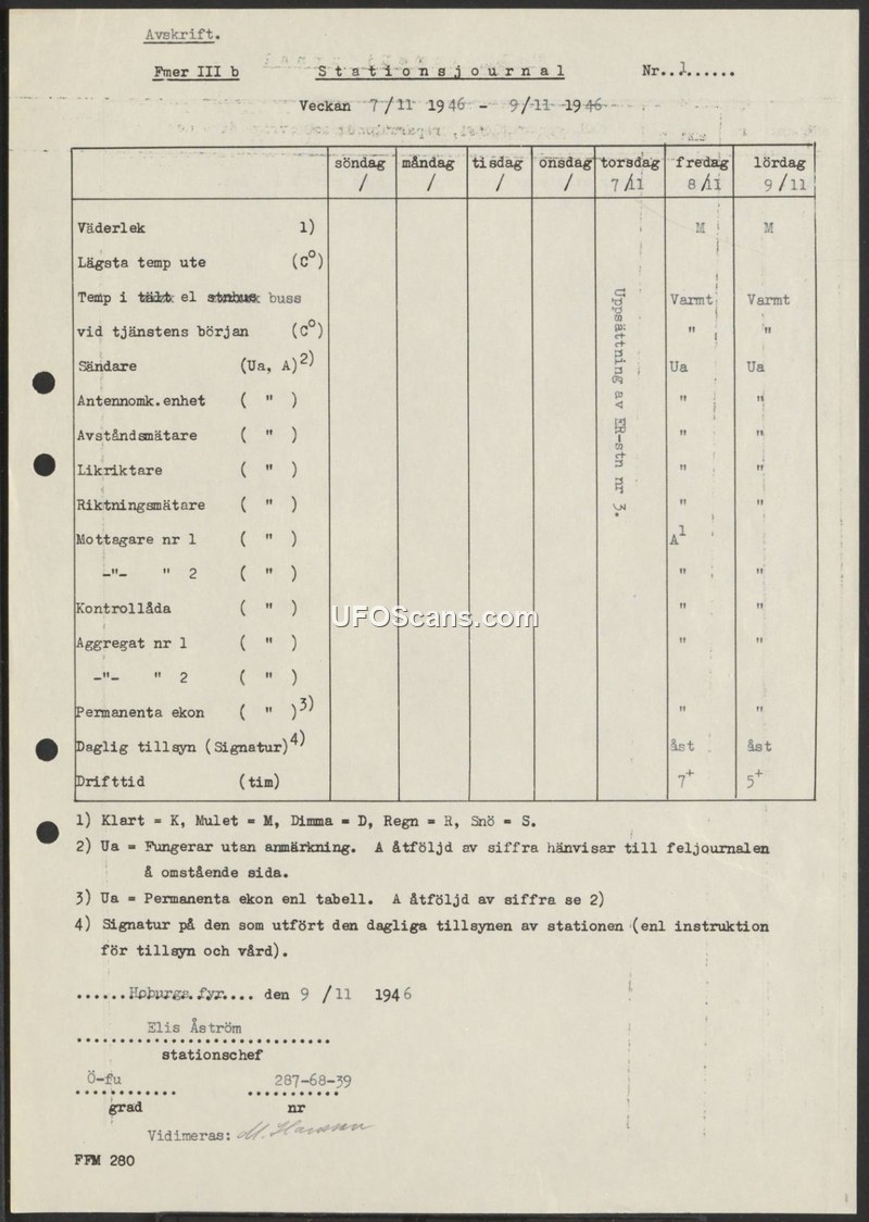 This is a 1946 station log from Hoburgs fyr detailing the technical status of equipment and the installation of 'ER-stn nr 3'. It provides a routine operational record for the station during early November 1946.