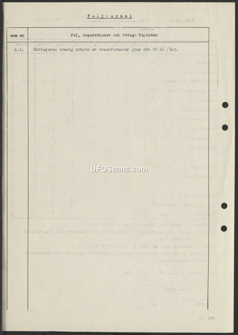 This document is a single-page fault log (Feljournal) written in Swedish. It records a technical maintenance action performed on a piece of equipment identified as a receiver (Mottagaren). The log entry, marked with the reference 'A.1', states that the receiver was broken and required the replacement of a transformer and a vacuum tube of the type CV 66. No further context regarding the nature of the equipment, the location, or the date of the repair is provided in the document.