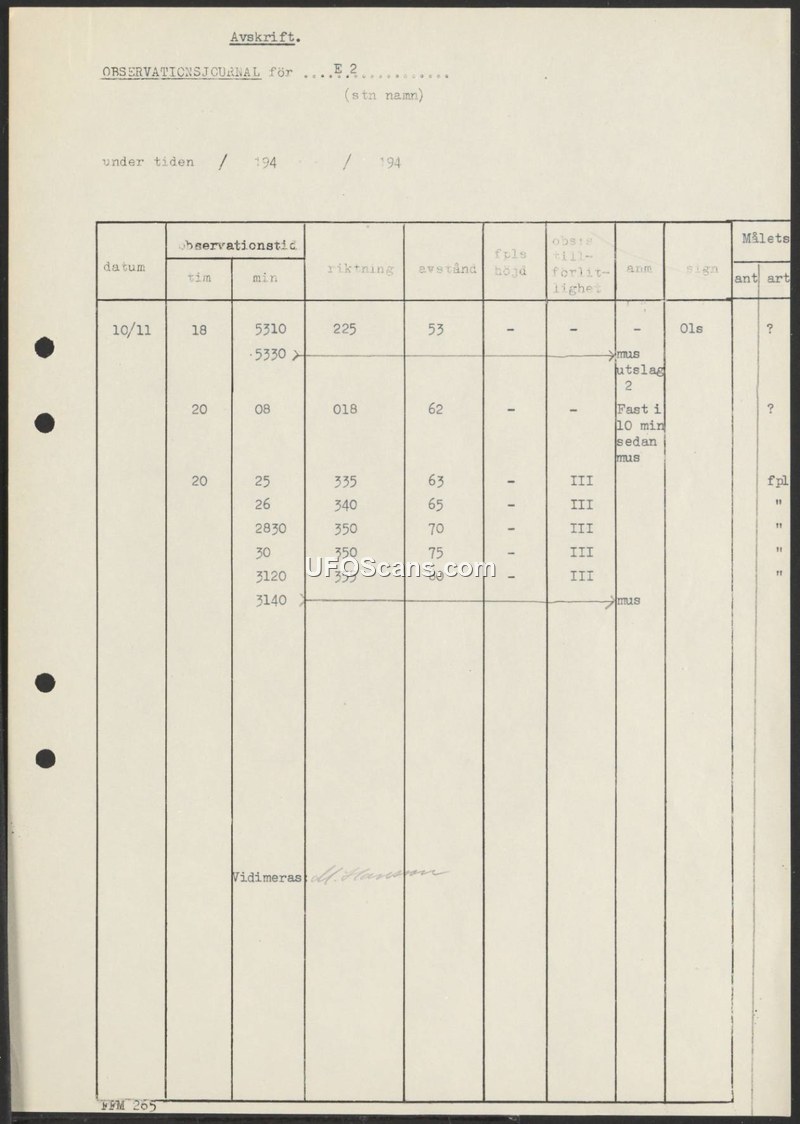 An observation log from station E2 dated November 10th, recording multiple radar or visual tracking events of unidentified targets.