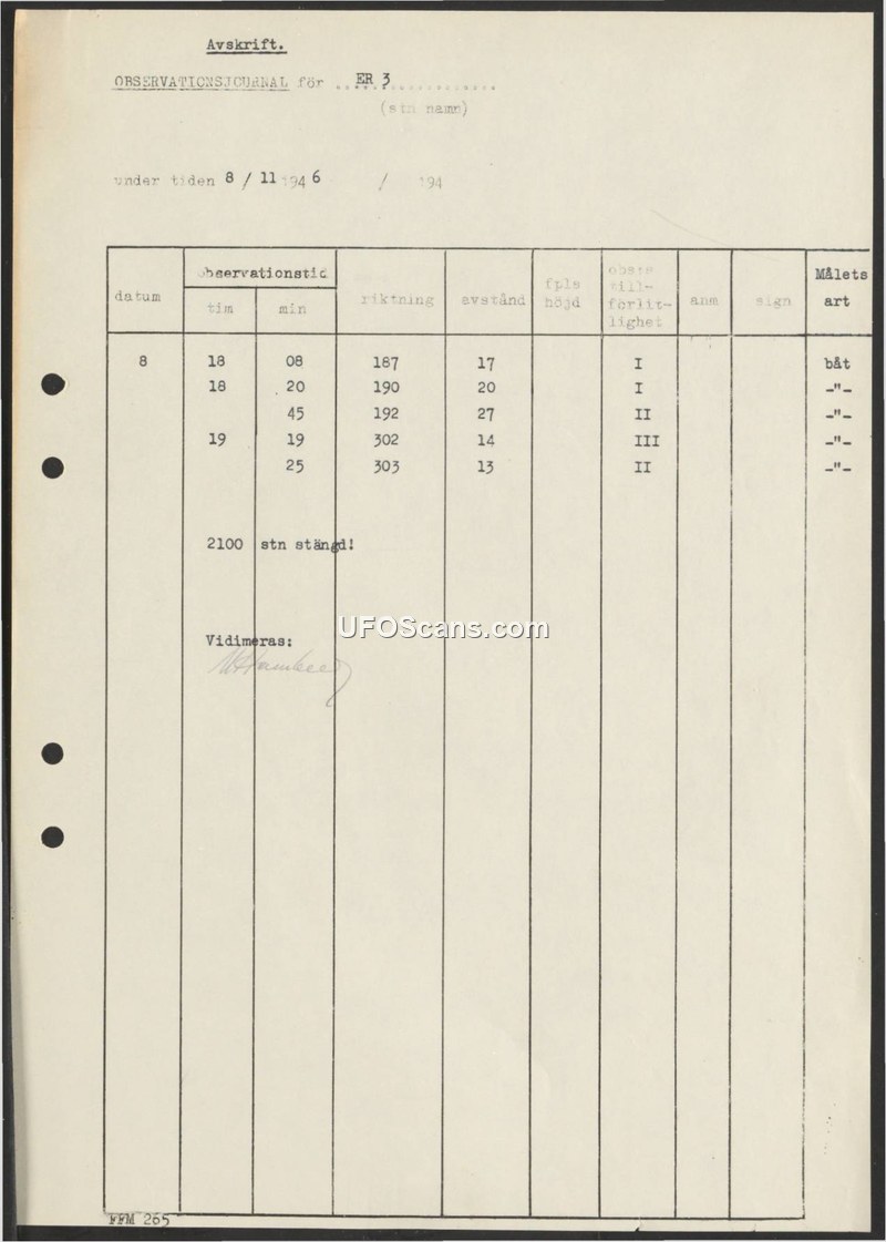 This is a Swedish military observation log from November 8, 1946, recording the tracking of boats from station ER 3. It provides a structured record of maritime sightings including time, direction, distance, and reliability ratings.