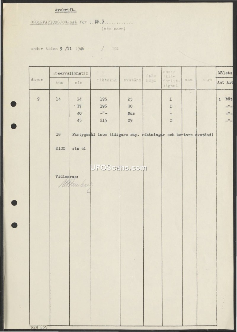 The document records a series of observations of a vessel on November 9, 1946, between 14:34 and 14:45, with a note at 18:00 regarding vessel movements within previous reported directions and shorter distances.