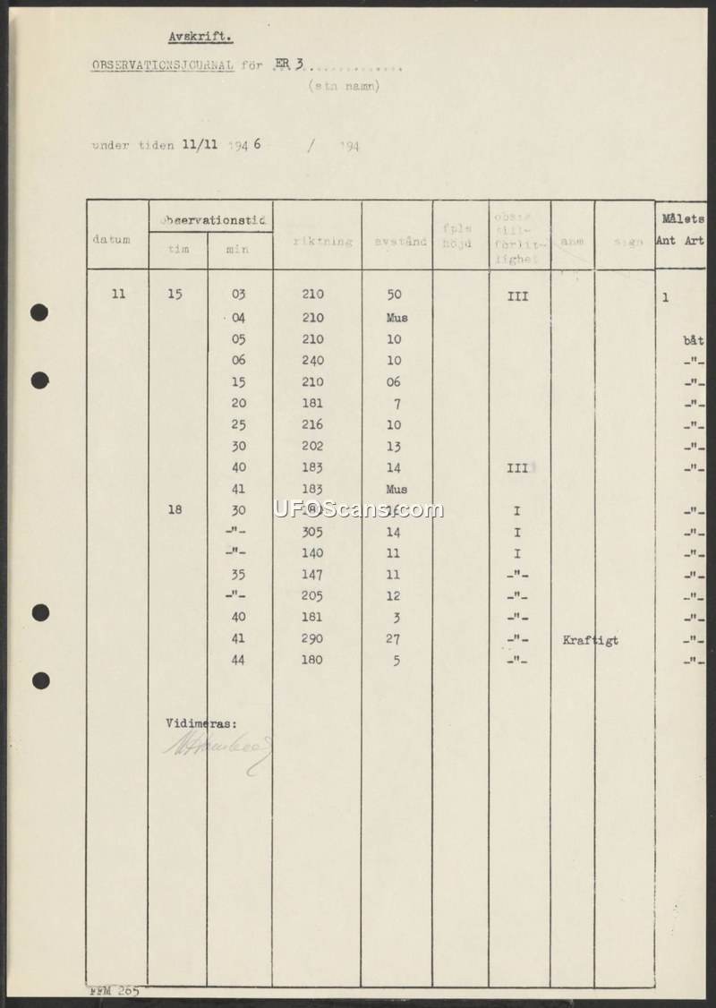 An observation log from November 11, 1946, recording multiple sightings of a boat from station ER 3. The document provides a structured timeline of movements and reliability ratings for the observations.