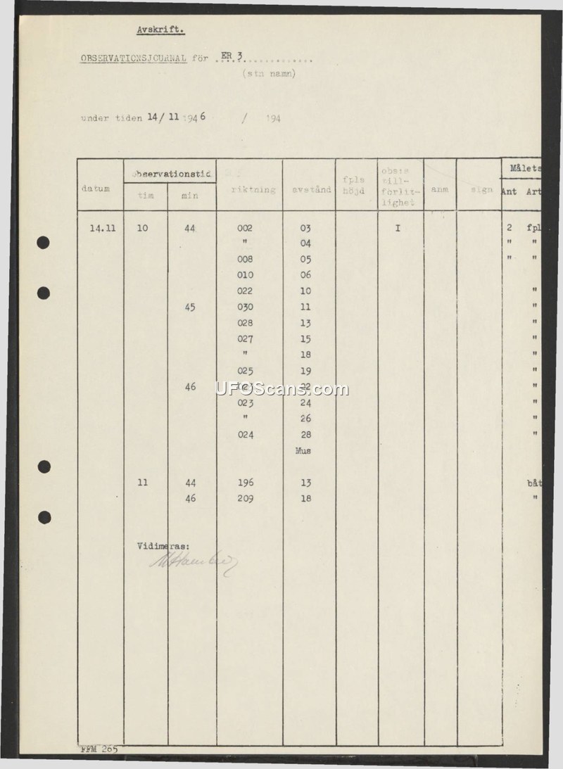 This document is a transcript of an observation journal (OBSERVATIONSJOURNAL) labeled ER 3, dated November 14, 1946. The log records a series of observations made between 10:44 and 11:46. The table includes columns for date, time (hours and minutes), direction, distance, altitude, reliability, and target type. The entries indicate observations of 'fpl' (flygplan/aircraft) and 'båt' (boat). The log tracks specific directional headings and distances for these targets over the course of the hour. The document is signed off with a 'Vidimeras' (certified/verified) stamp at the bottom.