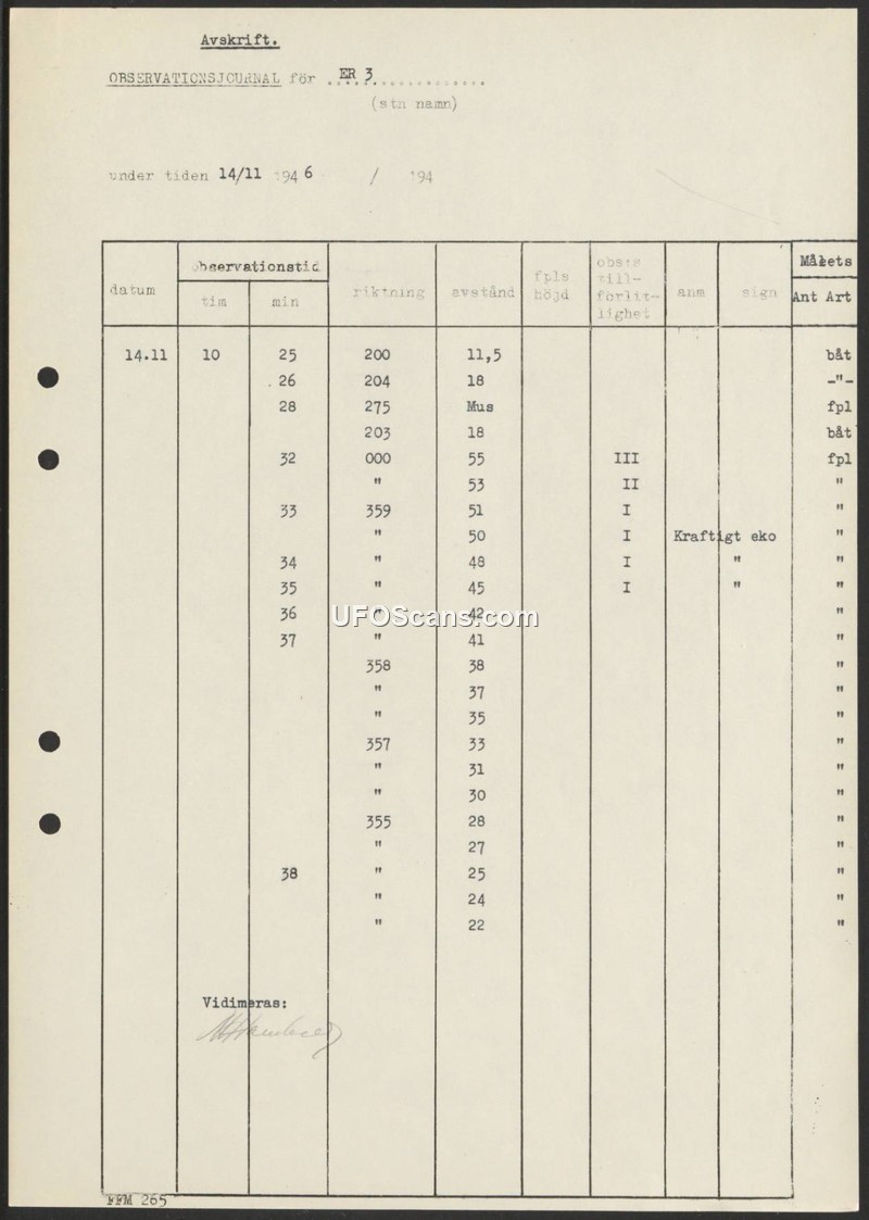 A Swedish radar log from November 14, 1946, documenting multiple radar contacts identified as boats and aircraft. The log tracks bearings, distances, and signal reliability, including a notation of a strong echo.
