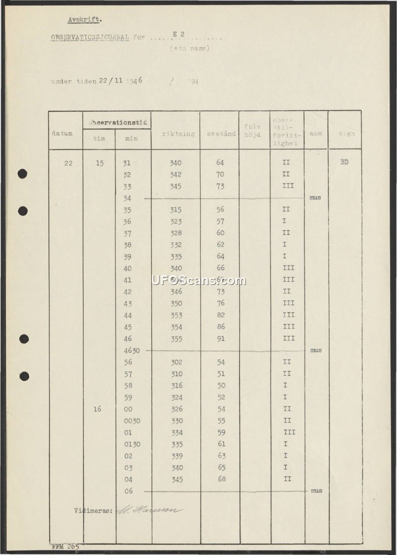 This is a 1946 Swedish observation log from station E 2 recording the time, direction, and distance of aerial phenomena. It provides structured data points for tracking sightings on November 22, 1946.