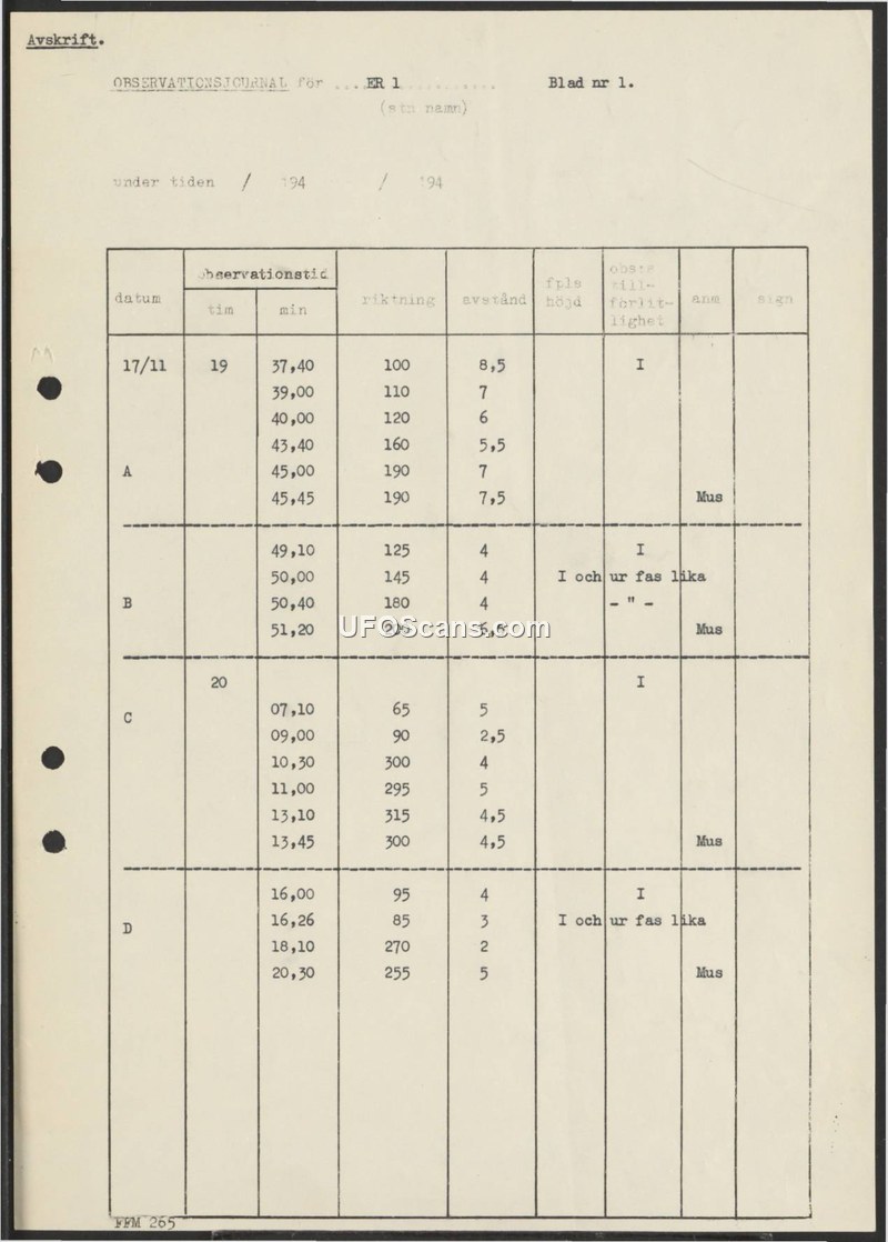 The document is a structured observation log recording time, direction, distance, and status of unidentified phenomena observed at station ER 1 on November 17, 1994.