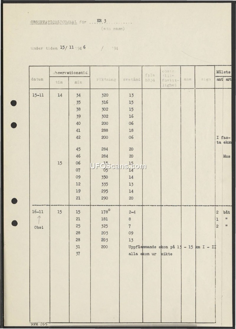 A Swedish radar observation log from November 1946 documenting tracking data for unidentified echoes and boat traffic. It serves as a primary record of radar activity at station ER 3.