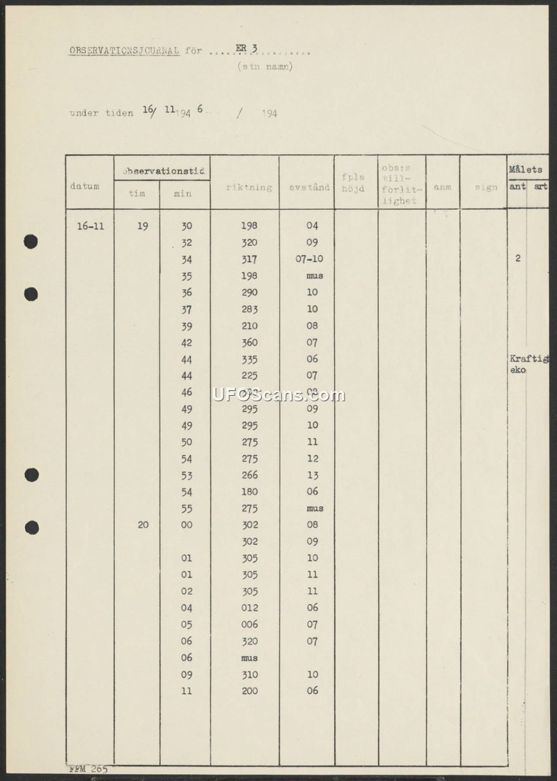 The document records a series of radar contacts tracked from 19:30 to 20:11 on November 16th. The target was noted as a 'strong echo'.
