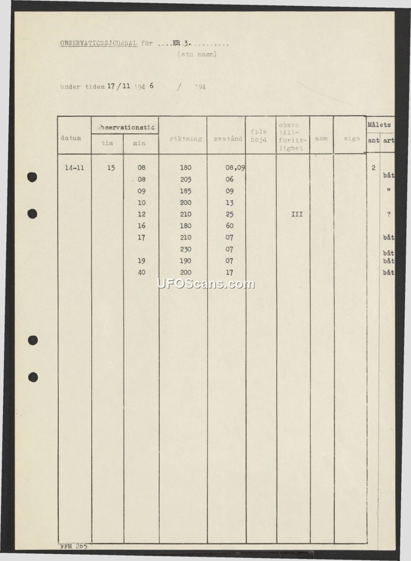 A Swedish observation log from November 1946 recording multiple sightings of objects identified as boats. The document provides a structured timeline of observations including direction and altitude data.