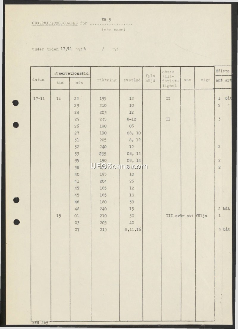 A Swedish observation log from 17 November 1946 recording multiple sightings of objects identified as boats. One entry notes that a target was difficult to follow.