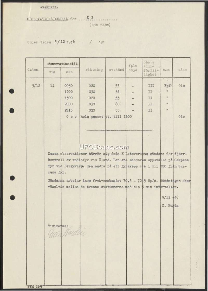 This document is an observation log (Observationsjournal) dated December 9, 1946, detailing a series of signal detections recorded on December 3, 1946. The log records five specific time entries between 0930 and 1515, noting directions (020 and 030) and distances (55 to 60). The author, G. Norén, provides a clarifying note at the bottom of the log explaining that these observations were not anomalous phenomena, but rather signals originating from the Royal Pilotage Board's (K Lotsverket) remote control radio beacon transmitters. These transmitters were situated at Garpens lighthouse near Bergkvara and on a lightship approximately one mile from the lighthouse. The equipment operated within the 70.5 to 72.5 Mp/s frequency band, with the two stations transmitting alternately in approximately five-minute intervals.