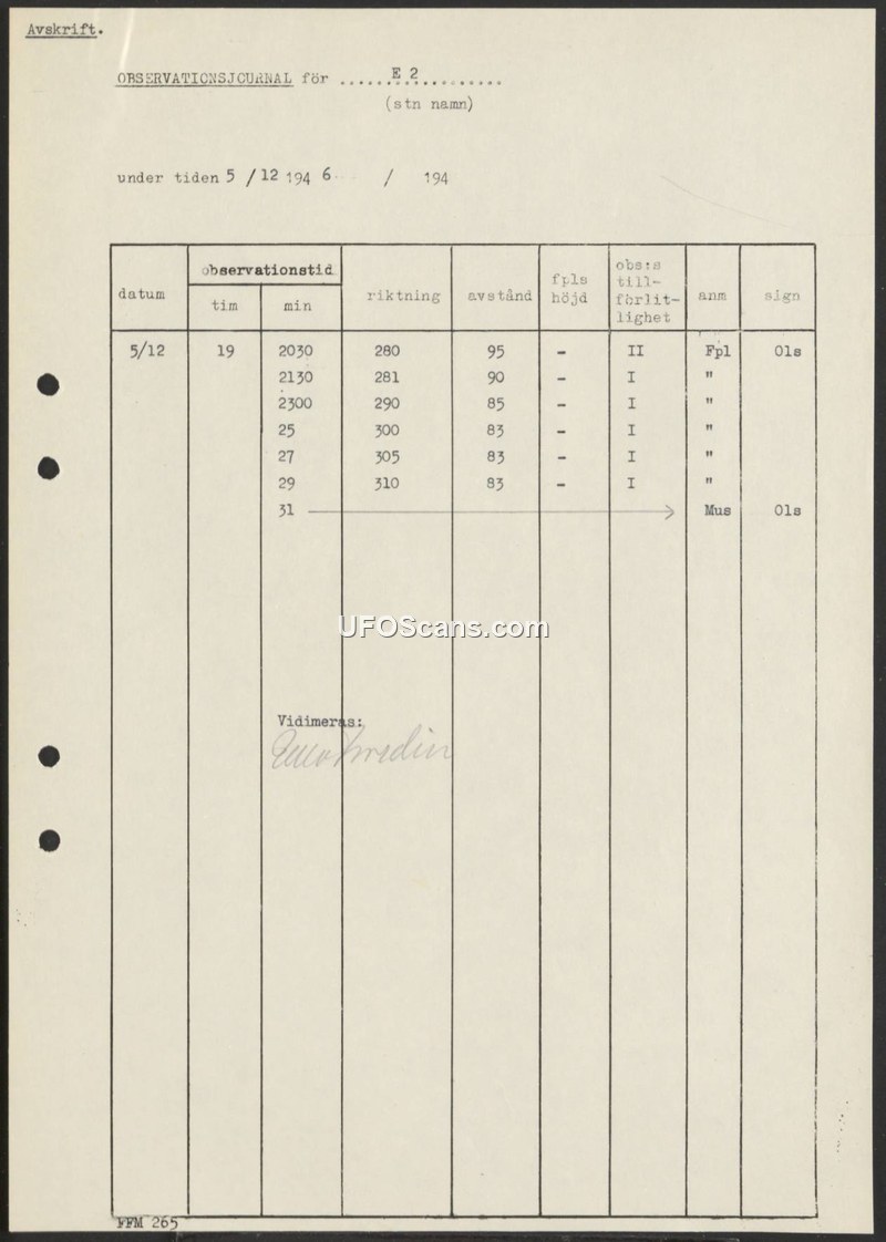 An observation log from Swedish station E 2 dated December 5, 1946, recording directional and distance data for unidentified aerial objects.